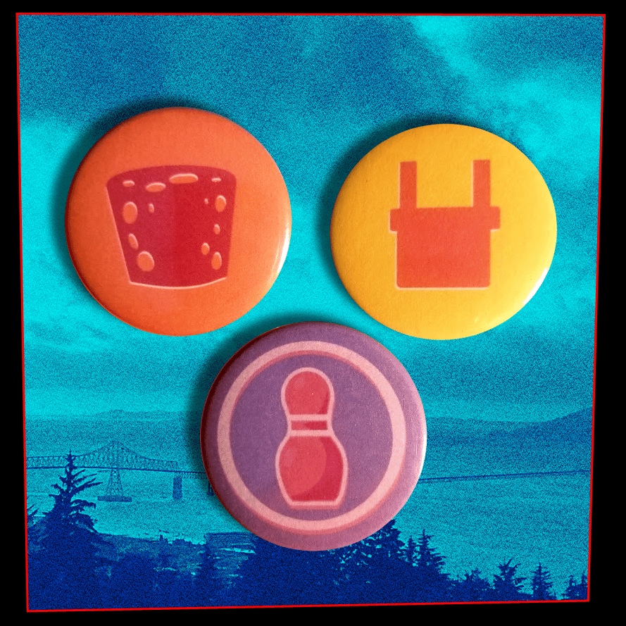 A set of three 1.46" pin-back buttons with the designs of the two competing teams, the Cunning Corks and the Paralyzing Plugs as well as STRIKE's communication device!